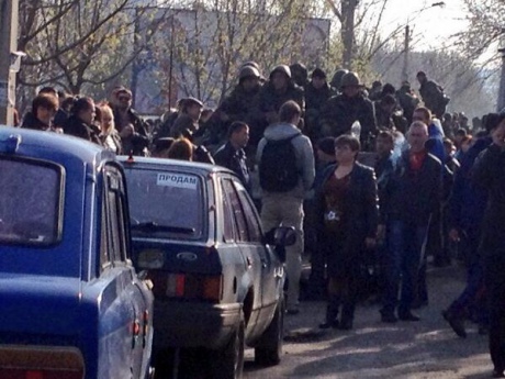 Местные жители блокируют военную технику в Краматорске, общаются с солдатами. Со стороны это выглядит миро, насколько это возможно. На улице Островского машины с десантурой. Местные жители заблокировали им дорогу. Над городом летают вертолеты.