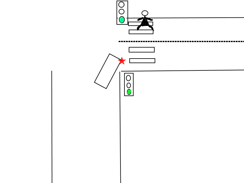 Проясните, пожалуйста. Ситуация: перекрёсток, я еду на зелёный и совершаю поворот направо. Пешеходам тоже горит зелёный, один пешеход начал движение по полосе слева от меня (встречная), а я в это время еду дальше не мешая пешеходу (он не дошёл до моей полосы). Рисовать не умею, изобразил на картинке как смог