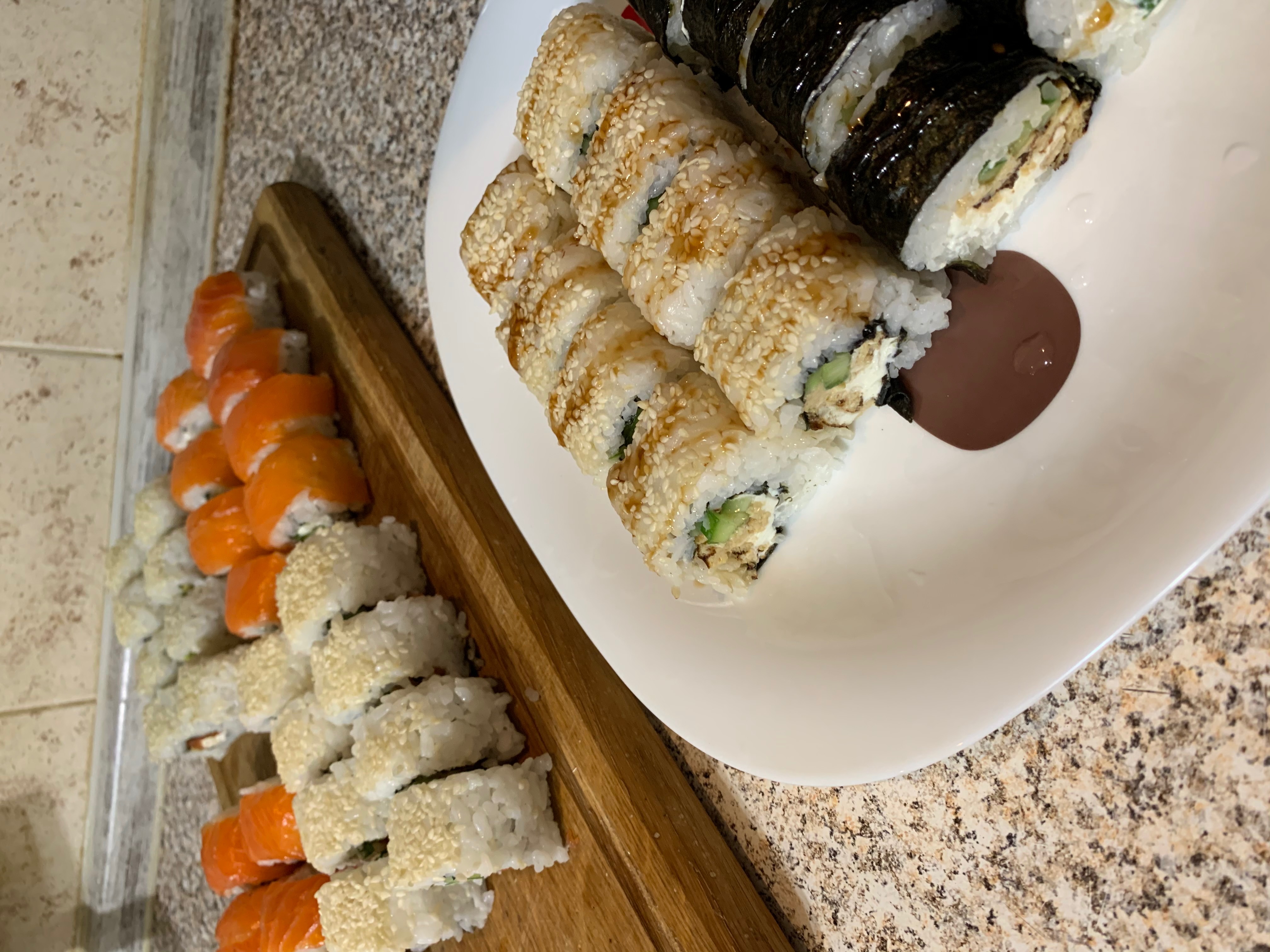 Посмотрел. Недорого. А где ещё заказывали? Мы последний раз заказывали ем рыбу и худею. И 2 раза делали сами. Второй заз все для суши купили на демеевке. Там всего 2 павильона но один был закрыт. Так как почти все было то там купили только соус и нори. Вот что получилось