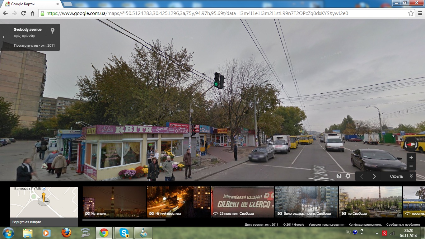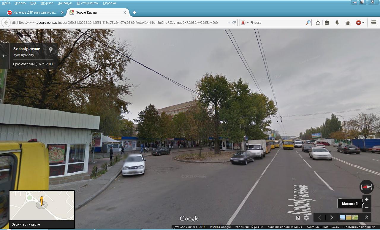 Ты прикалываешся? Какая сплошная? Как может быть ТАм сплошная? Это проспект Свободы, там три полосы. Где ты видел в Киеве место (кроме тех улиц, где правая полоса отдана для ОТ) правую полосу отделенной сплошной от двух других полос. Ещё раз. Чёрный авто выезжает из "кармана" на главную т.е. на пр. Свободы, где правый ряд занят припарковаными и не просто припарковаными, а по сути он "выныривает" как раз между маршрутками, которые (одни стоят на отстое, другие подъезжают/отъезжают) от отстановки.