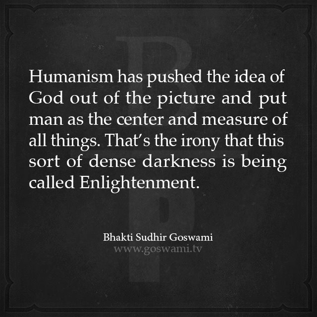 Ежи Лец прав. Гуманизм (в изл. выше Госвами Махараджа) чем-то напоминает торговлю краденным на базаре, когда стирают клеймо хозяина, шоб не палиццо. Или переименование улиц, городов и топонимов на местности, когда по дхарме Горішнім Плавням предписано бьіло бьіть Горішніми Плавнями, а не абстрактньім Комсомольском, что в итоге и было восстановлено. С гуманизмом сложнее - щетаю словцо выйдет из обихода и сотрется из памяти вместе с исчезновением евроатлантической т.н. цивилизации.