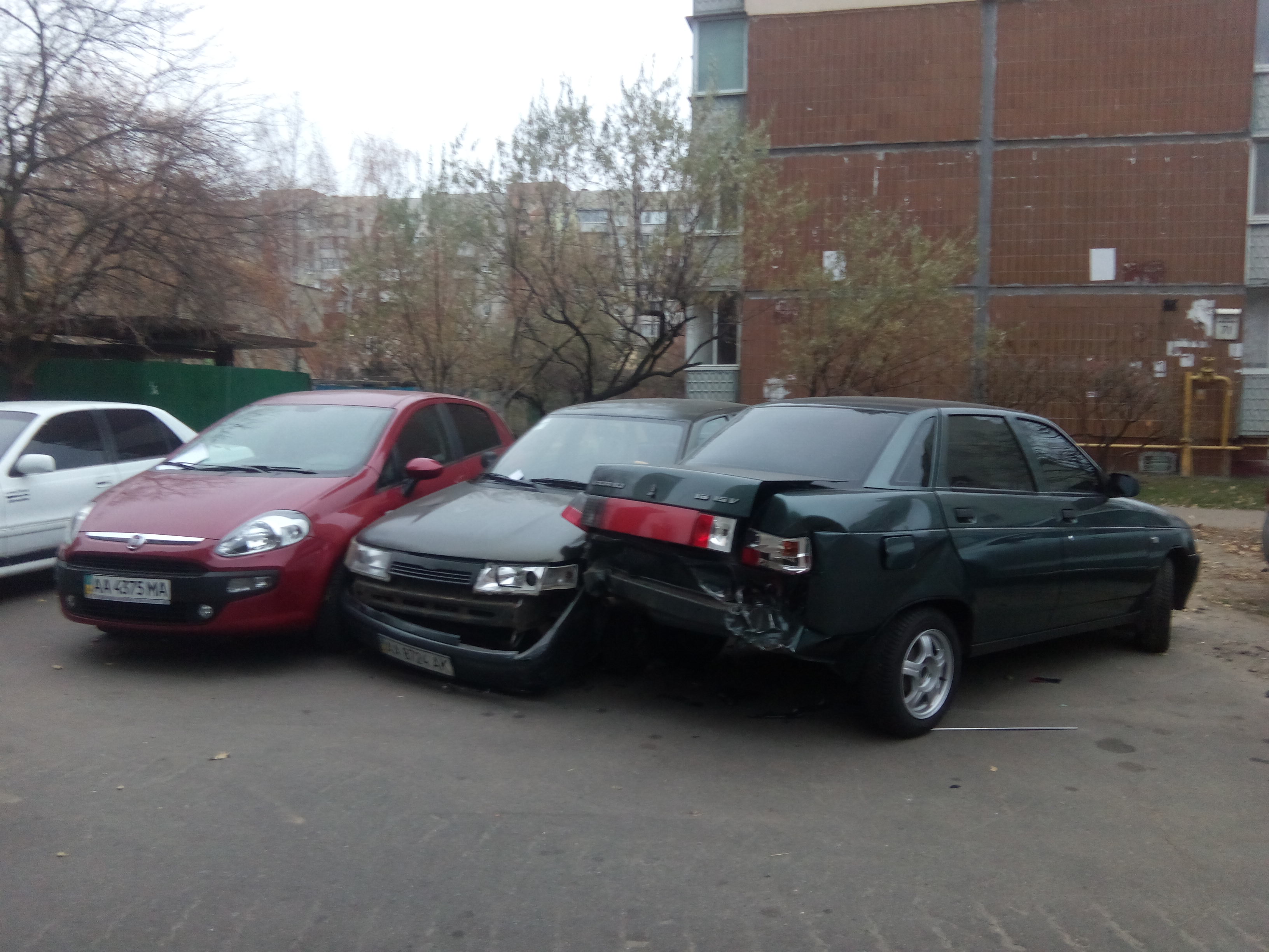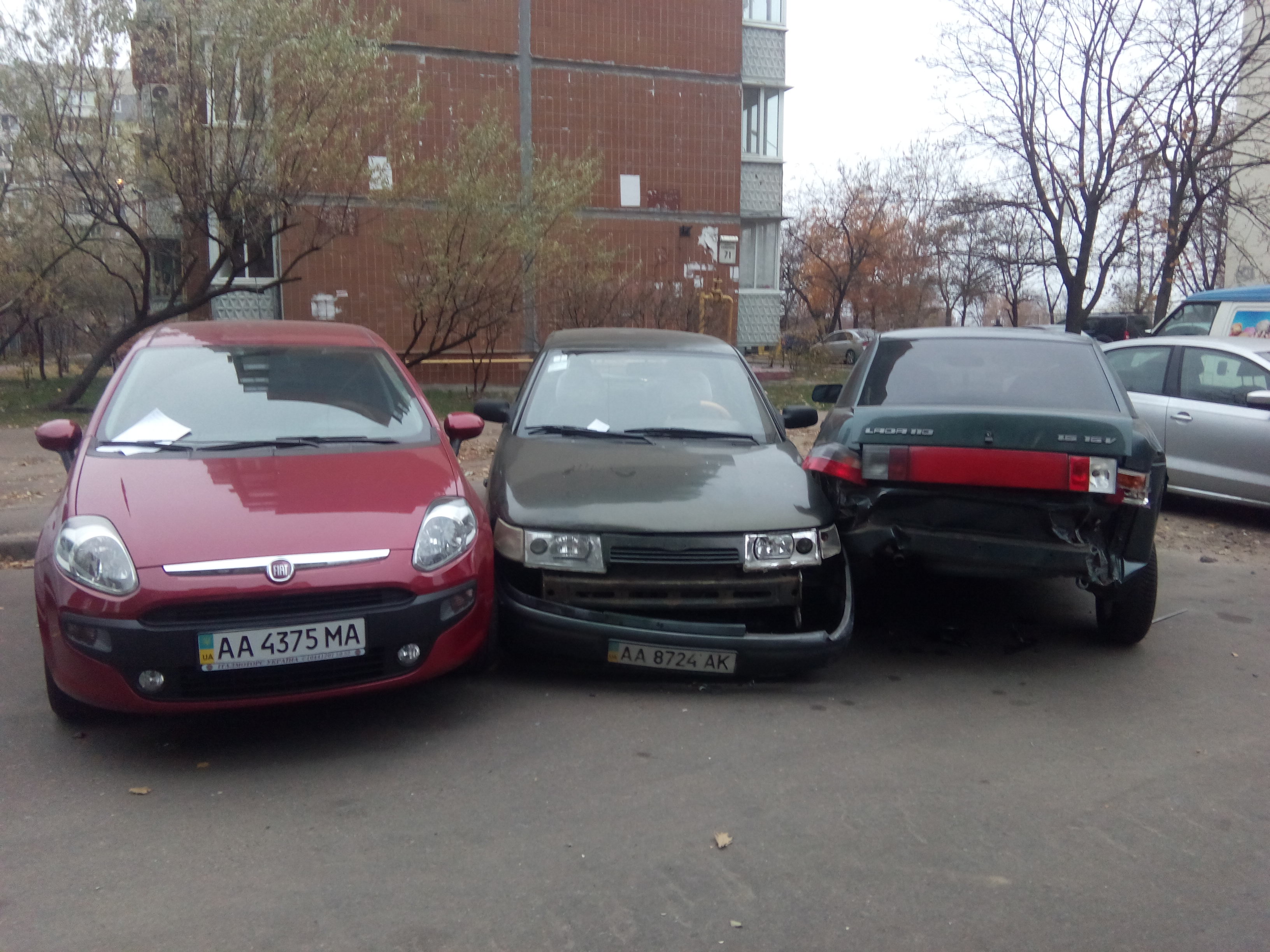 Виноват паркованец на авто с опавшим бампером. Сначала пытался запарковаться задом, и ввалил в жигуленку. Потом объехал по газону и запарковался передом, вылазил через багажник.