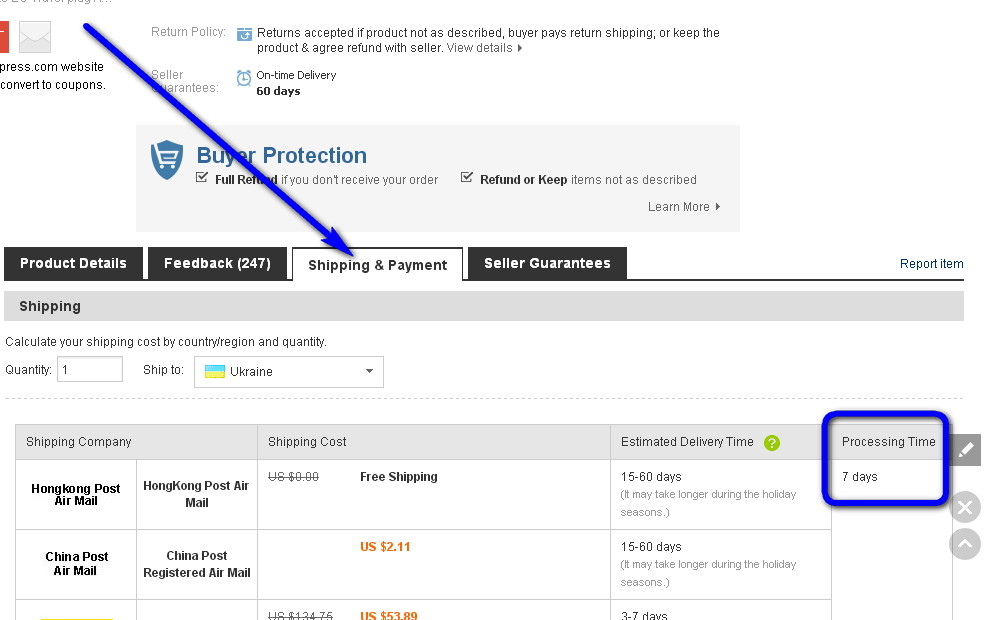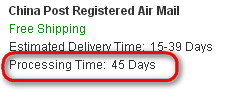Час обробки замовлення чітко вказується продавцем. Якщо продавець не встиг в означений термін, замовлення автоматично анулюється і гроші повертаються покупцю. Продавець не може подовжити термін, а покупець може, тому можлива ситуація, що продавець звернеться до покупця з проханням подовжити термін обробки. Термін, як я тому розумію, вказується в робочих днях, вихідні не враховуються, тому на десять робочих днів припаде, певно, чотирнадцять календарних.