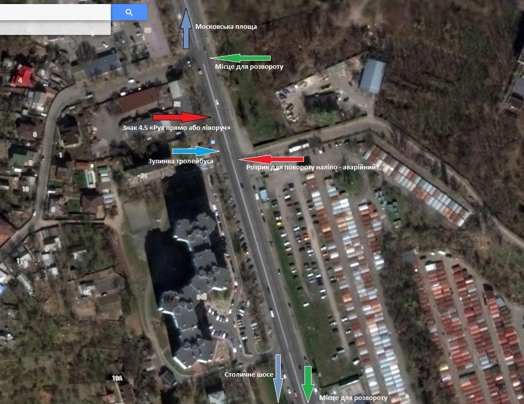 Шановні учасники Форуму, Будь ласка, підкажіть, куди слід звернутися з офіційним зверненням, щоб вирішити проблему з аварійною розміткою (прибрати розрив) і чи є в цій ситуації підстави для такого звернення? Ситуація наступна (фото додається): на проспекті Науки, 54 (Київ) відносно недавно з'явився розрив для повороту наліво (на вул. Ракетну). Прямо біля розриву тролейбусна зупинка. Перед розривом (якщо рухатися в сторону Столичного шосе) повісили знак, який дозволяє поворот ліворуч. Цим розривом користуються як ті, хто рухається в сторону Столичного і повертають на Ракетну (навіть фури!!!), так і ті, хто їде в сторону Московської пл. (для розвороту чи повороту в двір), хоча через 50 м є нормальний розворот. Більше того, цим розривом для повороту наліво користуються як ті, хто виїжджає з Ракетної, так і ті, хто виїжджає з двору будинків 54 і 54-Б. І це все на проспекті з 6-ма смугами руху, де рідко хто їде менше 80 км/год!. За декілька місяців, коли з'явився розрив і знак, там уже сталося два ДТП (це ті, що я бачив, може було й більше). Кожного дня бачу там безліч аварійних ситуацій. Коли фура стоїть для повороту наліво, а з зупинки виїжджає тролейбус чи маршрутка, там фактично треба зупинятися, бо крайня права зайнята припаркованими машинами, і тролейбус одразу їде в середній ряд. Цей розрив нічого, окрім створення аварійних ситуацій, для зручності чи безпеки руху не дає. Як видно на фото, там ніколи його небуло, і там є два нормальних місця для розворотів. Питання: 1. Чи можна було тут робити цей розрив? 2. Куди потрібно звернутися, що прибрати цей розрив і знак, який дозволяє поворот? Буду дуже вдячний за допомогу!