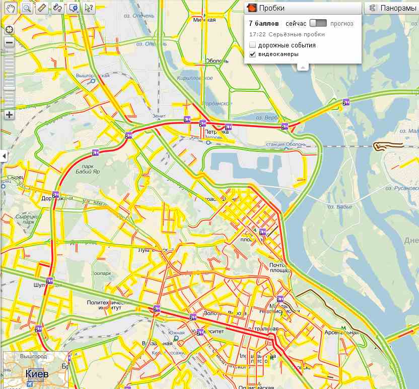 По данным сервиса "Яндекс.Пробки", рекордная пробка образовалась 5 декабря в 17:49, парализовав движение на улицах Гетьмана, Довженко и Телиги. Также "тянучка" наблюдалась на Московском проспекте и Московском мосту. В целом, машины застряли на дорогах от Борщаговской улицы до проспекта Генерала Ватутина.
