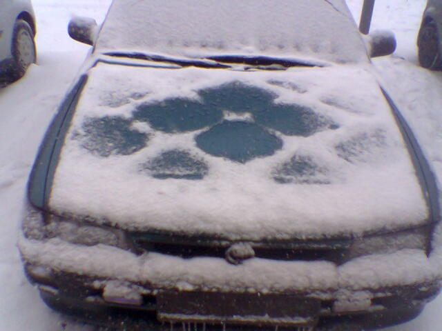 Не знаю, может это и стандартное явление, а я увидел первый раз. Кто-то прогревал машину, и на капоте сквозь снег явственно проступил узор в виде цветка. Понятно, что это таким образом утеплитель приклеен, но тем не менее...