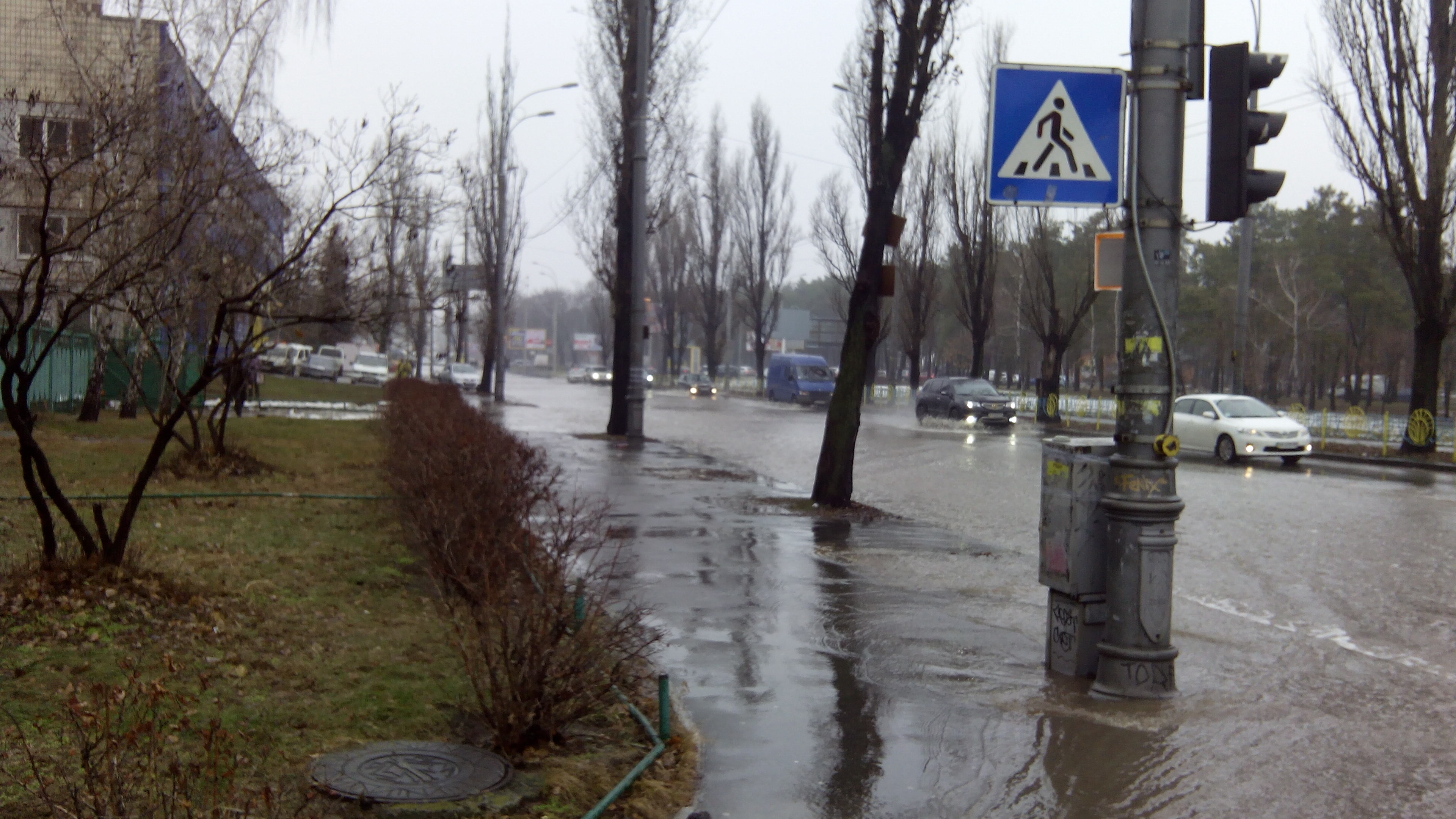 Освободителей в сторону Броварского стоит. Прична: прорыв трубы на пресечении Освободителей/Броварской. В районе металобазы порядка 50 см. воды.
