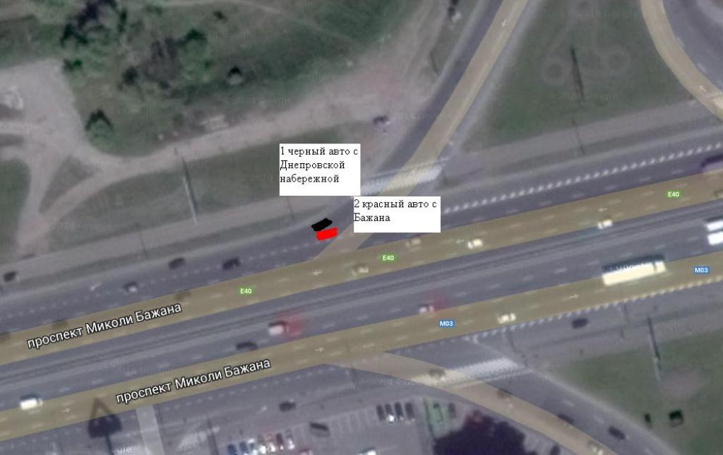1 автомобиль заезжает на полосу разгона с правого ряда, 2 автомобиль хочет использовать 5 полосу для движения в сторону Южного моста (неважно как он попадает на полосу разгона: с обочины которая на Бажана заасфальтирована и широкая, либо перестраиваясь с 4 полосы на полосу разгона) Спасибо