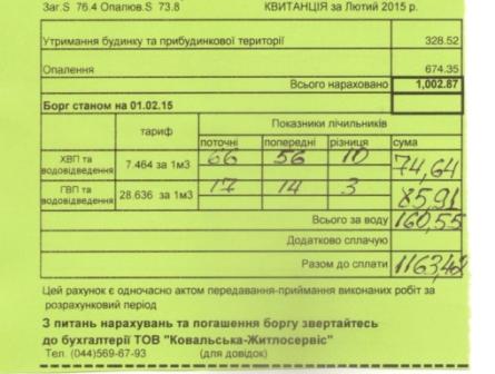 утримання будинків та прибуд. територій тариф 2,67 нараховано 273,41грн елктроенергія від 0,237 до 1,34 за 1квт центр постач хол води та водовідведення тариф 7,464 центр водовідведення гор води 3,576 центр постач гор води 21,6 опалення без лічільника тариф 284,69, за січень нараховано 595,92 грн