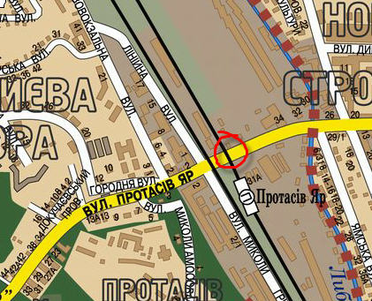 Знаходиться в крайньому ПРАВОМУ ряді в напрямку руху в сторону Соломянської площі.