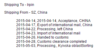 сам поражаюсь, но реально идут. И это с учетом праздников. 2015-05-04 00:00 Номер товара RF027671185CN доставляется адресату лично на 04.05.2015 Фондом почтовый индекс 03151 Киев 151. Origin Country - Tracking Consuming: 1110 ms - Go to official website 2015-04-29 01:23 Шанхай, посадки 2015-04-28 06:51 Шанхай Пудун, левой области переходов 2015-04-28 06:28 Шанхай Пудун, reach 2015-04-27 02:49 Бюро обмена Shanghai, 2015-04-26 20:54 Бюро обмена Шанхай был открыт 2015-04-25 20:22 Рекламодатели международных посылок, слева, следующая остановка «рекламодатели премьер» 2015-04-25 20:13 Уплотнение широкий международный Малый пакет 2015-04-25 20:13 Была получена электронная информация 2015-04-25 20:10 Рекламодатели международные посылки была принята