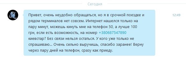 Привет, очень неудобно обращаться, но я в срочной поездке и рядом терминалов нет совсем. Интернет нашелся только на пару минут, можешь кинуть мне на телефон 100, а лучше 150 грн, если есть возможность, на номер +380978398383 киевстар? Без связи нельзя остаться. У кого уже только не спрашиваю... Очень сильно выручишь, спасибо заранее! Верну через пару дней на телефон, сразу как приеду.