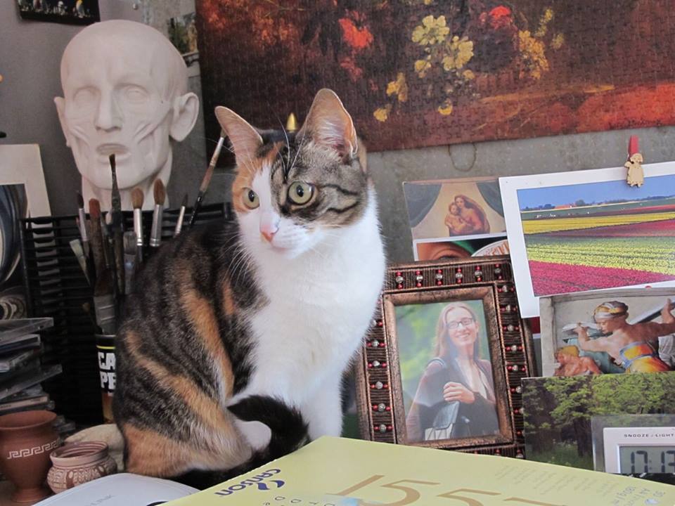 Кошка из семьи художника? Можно на этом ее через фейсбук попиарить. Возможно кому-то будет лестно взять кошку из хорошей семьи, музу творческого человека. Кстати, внешность такая, что рисовать ее одно удовольствие.