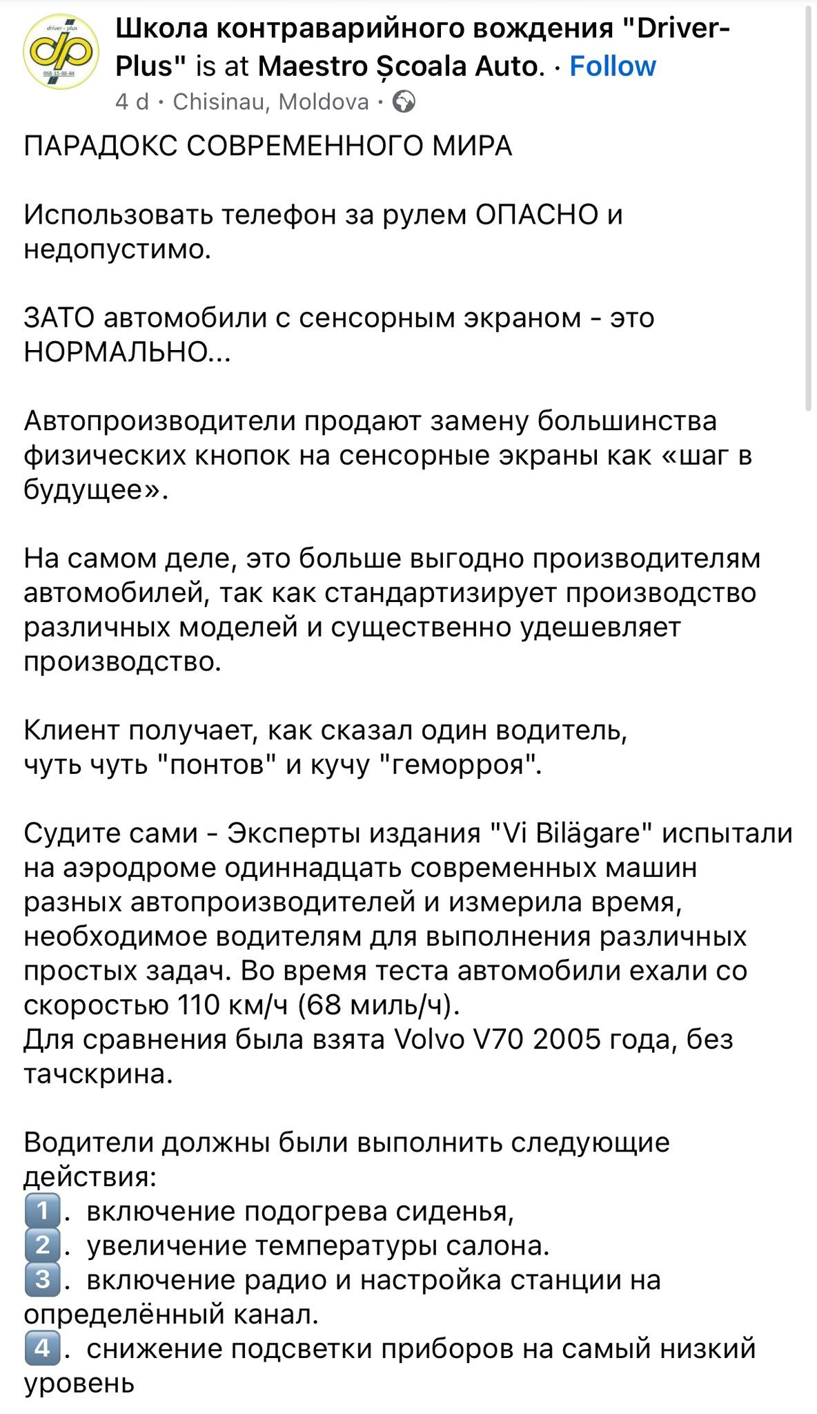 Было бы честно со стороны автопроизводителей всю эту сенсорную красоту и функции, засунутые в менюшки, компенсировать автопилотом. Ну то есть если мне нужно несколько секунд лазить по менюшкам, отвлекаясь на сенсорный экран, будет справедливо, если авто в это время перенимет мое управление: смотрит на знаки, светофоры, разметку, держит полосу, держит интервал, не сбивает людей, ну и так далее. А то получается как-то некрасиво.