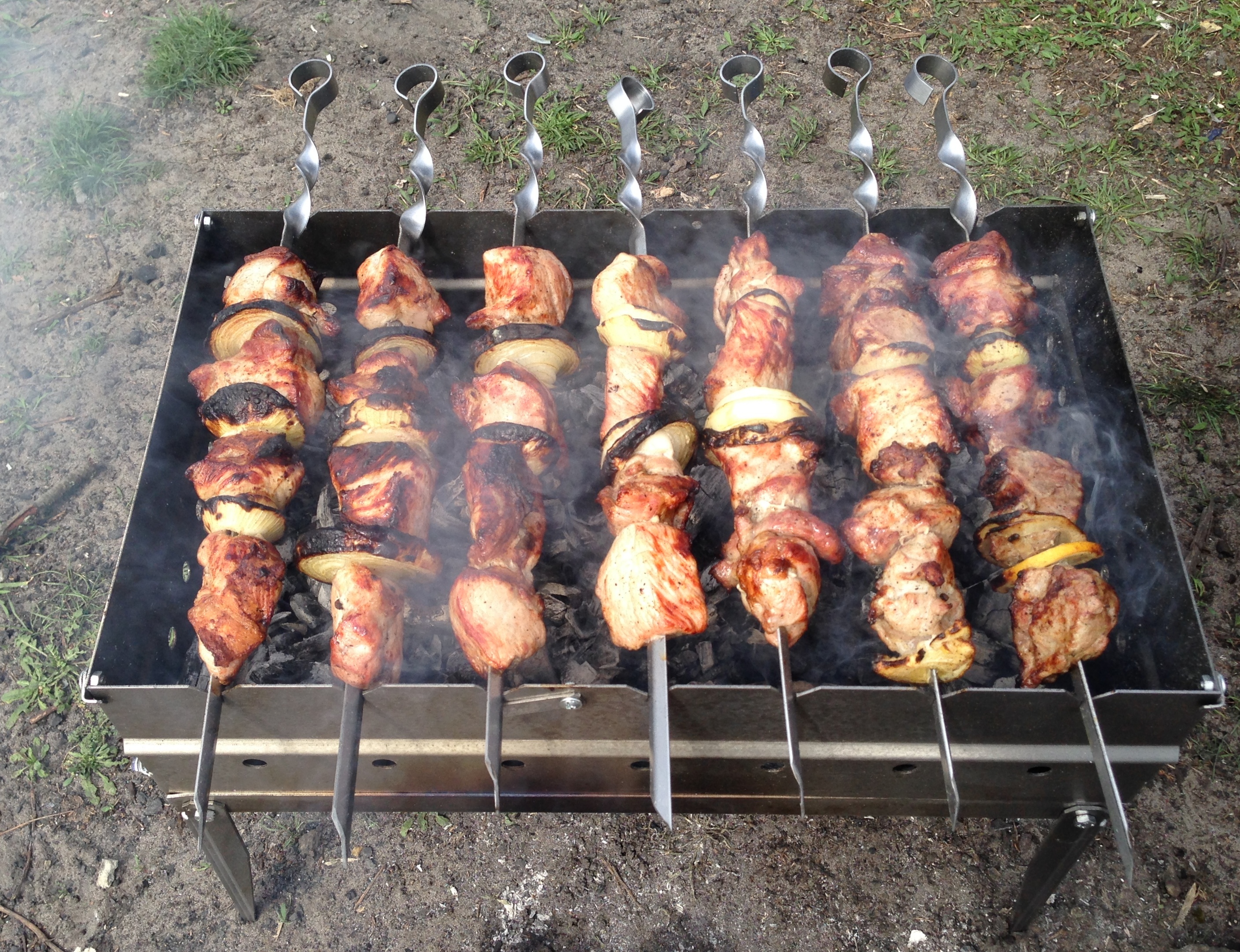 я чуток выше ссылку давал на такой же только у моего есть еще выемки - можно регулировать высоту шампуров, оч.удобно. а так еще и длинную картоху в фольге вниз, а мнясо наверх - отлична получилось