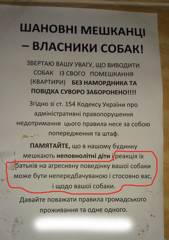 Всем привет. Второй раз нападает одна и та же собака (100% не провоцировал). Собака дворовая, таскается, как я понял, с дворовой шпаной, причем при втором нападении местные бабульки (свидетели ситуации), советовали надрать уши шпане (хотя какой с них спрос?). Укусила только сумку, бросается только за то, что рядом проходишь. Реальный стрем за маленьких детей. Зашел в участок милиции, спросил куда обращаться, ответ (Что не знают, они этим не занимаются и пристрелят ее только если их покусают, пишите заяву в администрацию города). Спасибо, что не президенту.