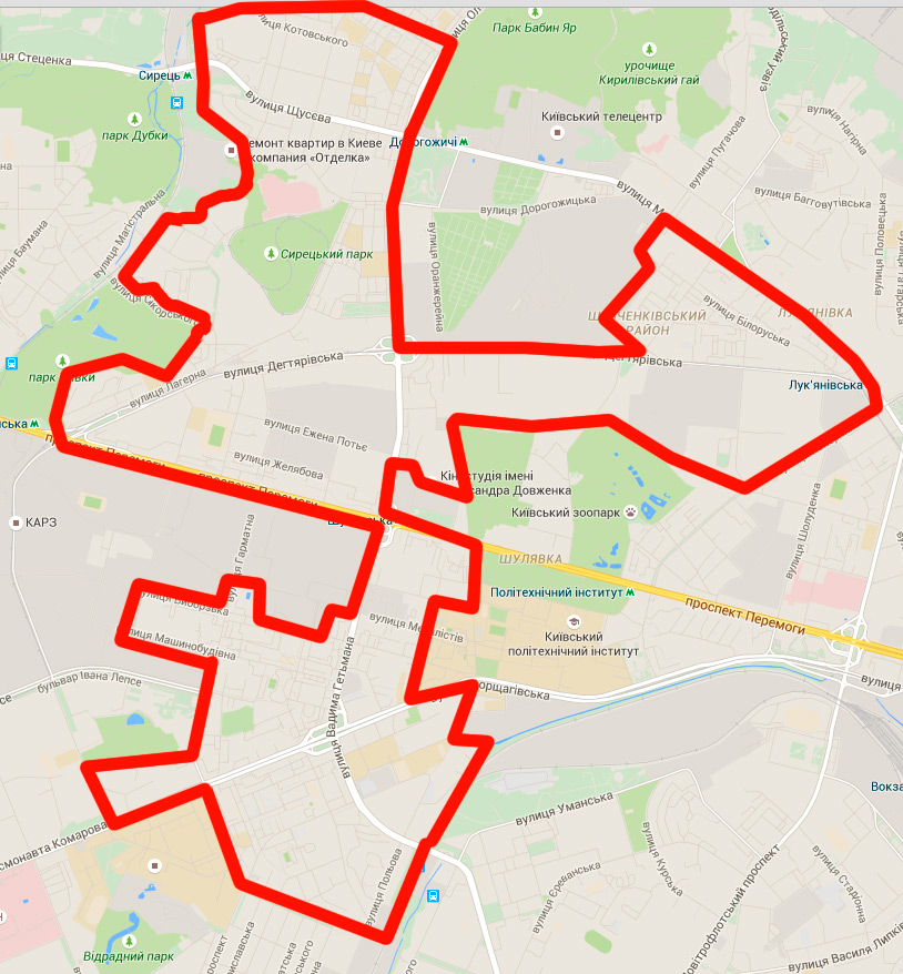 Коллега (девушка) ищет однушку в районе, прилегающем к ул. Дегтяревской или Телиги->Гетьмана (от примерно Дорогожичей до Кардач), с мебелью и техникой. Она здесь не зарегистрирована, но все ваши предложения увидит. Контактную информацию и цену можно мне в личку, если не хотите в открытую. P.P.S. Визуализировал желаемую область поиска на карте: