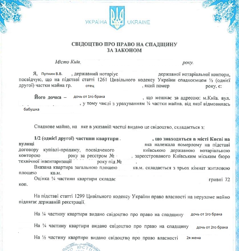 Возможно есть на форуме люди, которые подскажут по ситуации. У родственницы умер отец. Уже достаточно давно (10 лет прошло). Осталась квартира. Она - дочь от первого брака, есть еще дочь от второго брака и жена, с которой он уже и не жил вместе последнее время. Бабушка отказалась от своей части квартиры в пользу дочери от 1го брака. На днях глянул "Свідоцтво про право на спадщину" и сломал моЦк. Оно выдано на 1/2 квартиры: 1/4 дочери от 1го брака + 1/4 бубушкина. Но ниже разделено следующим образом: 1/4 дочери от 1го брака 1/4 дочери от 2го брака 1/2 второй жене