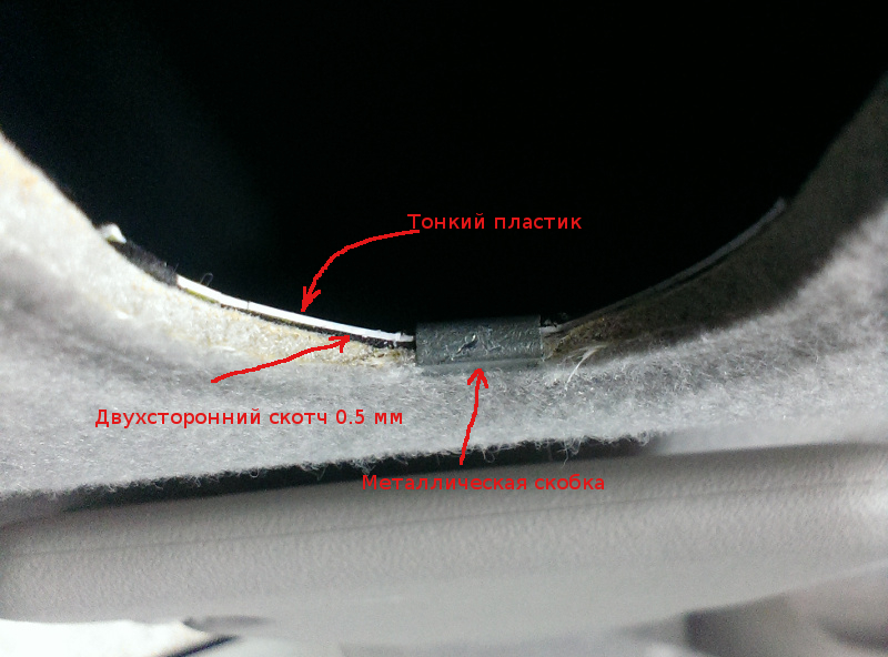 Ну я же сделал .. главная фича - достаточно большая площадь приклеивания пластика к оббивке и хорошим скотчем (не канцелярским), и важно, чтоб металлическая скобка держалась и за оббивку и за пластик.