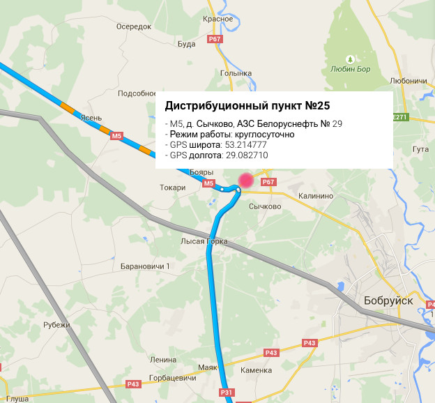 Сори путано написал, рамка за Бобруйском. На картинке маршурут через Мозырь, а красным отмечен сервисный пункт, и если на него не заехать, то следующий в Теплухах ЗА первой рамкой.