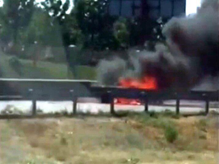 Только что на Окружной дороге внезапно взорвался легковой автомобиль. Движение на всем участке трассы заблокировано.