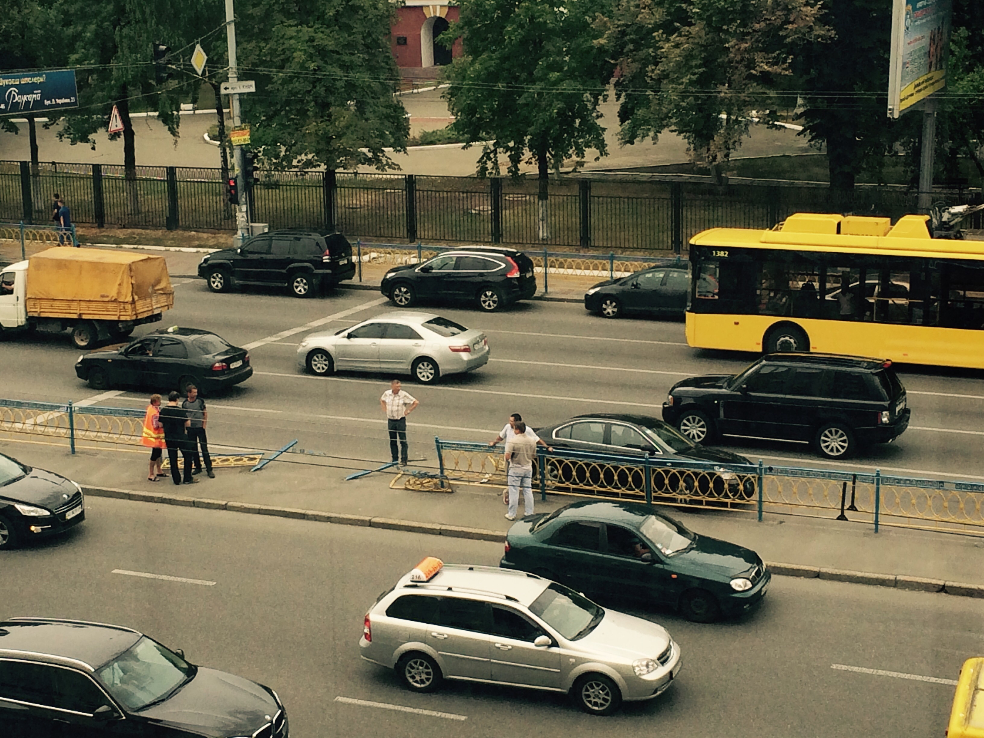 БМВ Х3 с ободраным левым боком, белый с номерами АА 1818 ?? (она на Чигорина во дворах ночует) стоял почти на Кудри носом от леси. Судя по всему БМВ ехал по Леси от Печерского моста в сторону Бессарабки поворачивал налево на Кудри. А в это время черный КИА рванул с Кудри налево на Леси, где то посередине той части Леси, по которой поток идет из центра они и встретились и КИА после удара изменил направление и пошел направо в забор. По крайней мере такая схема видится наиболее вероятной. На этом перекрестки такие аварии 3-5 раз в год случаются. П.С. Посольство Израиля находится именно в том здании, откуда сделано фото. Более того, фото сделано почти с места, где на первом этаже парадный вход в посольство с флагами и охраной. Вот с того ли этажа - трудно сказать.