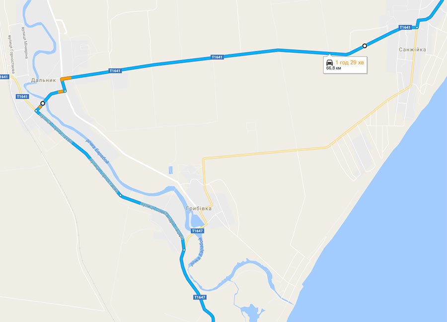 В Санжейке поворачиваете на Дальник. В Дальнике на Т-образном перекрестке налево, затем, метров через 200, направо, переезжаете реку и поворачиваете налево. Выезжаете на основную дорогу уже за Грибовкой, сразу за мостом через реку. Таким образом объезжаете участки с ямами и стремные опасные повороты перед Грибовкой. Расстояние на пару км больше, но дорога гораздо лучше, трафик мизерный, нервы и машина целее.