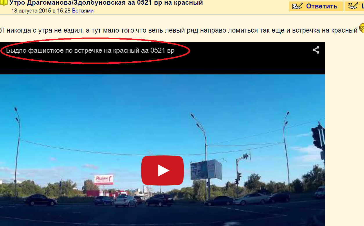 Досмотрел до 0.14 дальше не стал. Увидел несколько которые вперлись за стоп линию, тот, у кого регик исполнил не ведомый мне маневр на перекрестке. Сместился зачем то в лево, наверно увидел что картонка висит, и решил так пропустить удящих с сзади. Видимо понаехавший из других регионов, потому что раньше он не знал что там стрелка есть, а в последний момент решил показаться белым и пушистым, возможно АН либо ВВ, на них сейчас грешат, что все проблемы на дорогах от них. А да, потом перемотал по быстрому видео, увидел мотороллер, к которому у ТС претензий нет, очевидно, он считает что так и нужно ездить. А если серьезно, не надоело всякое дерьмо постить? Еще и с непонятными грубыми названиями.