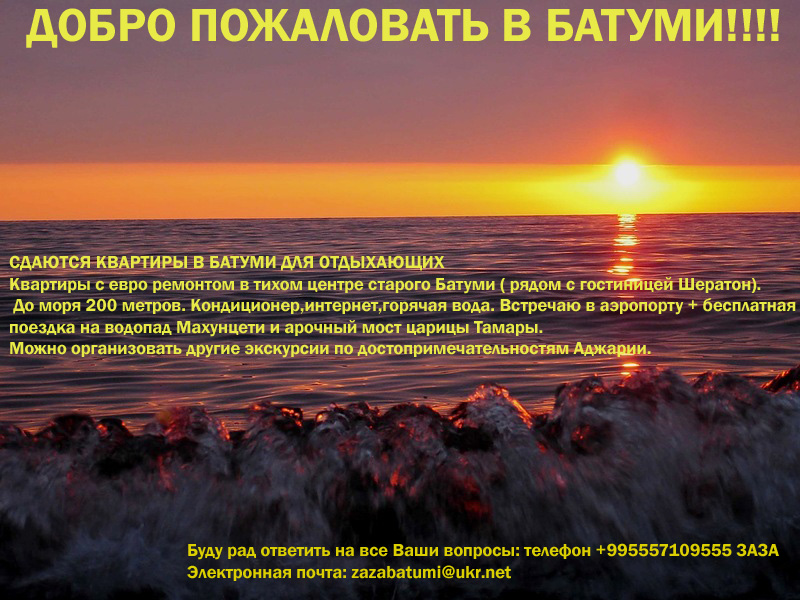 Новый год у моря. Веселье, иллюминация, тусовки и смех. А так же уникальные зимние экскурсии по Аджарии. И конечно Горячее застолье, пламенные тосты и реки счастья! КВАРТИРЫ ПОСУТОЧНО!!! В цену аренды уже входят бесплатные экскурсии: покажу и расскажу все о местах отдыха,отвезу абсолютно БЕСПЛАТНО в горы на водопады,в Аджарский винный дом,в ботанический сад,к мосту Царицы Тамары. Обещаю,что Вы не будете разочарованы отдыхом у меня. мой телефон: +995557109555 Мой скайп zaza.1973 Мой электронный адрес zazabatumi@ukr.net Или в вайбер +995557109555 Заза