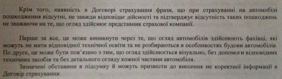 Про КАСКО рассказываю. Ситуация с клиентом. Заключает договор страхования КАСКО. В договоре чёрным по белому указано, что на момент заключения договора и осмотра автомобиль без повреждений. Попадает в мелкое ДТП. Ему отказывают на том основании, что до этого уже было ДТП (получал возмещение по ГО виновника) с повреждением примерно тех же элементов. И якобы это повреждения от первого ДТП. Но он после первого ДТП и до заключения договора КАСКО отремонтировался... Подаём в суд. Страховая компания присылает отзыв на исковое заявление. Там шедевр на шедевре, но больше всего мне понравилось объяснение, почему могут в договоре не быть указаны имевшиеся на машине на момент осмотра повреждения См. фото. Суд в итоге наш иск удовлетворил полностью.