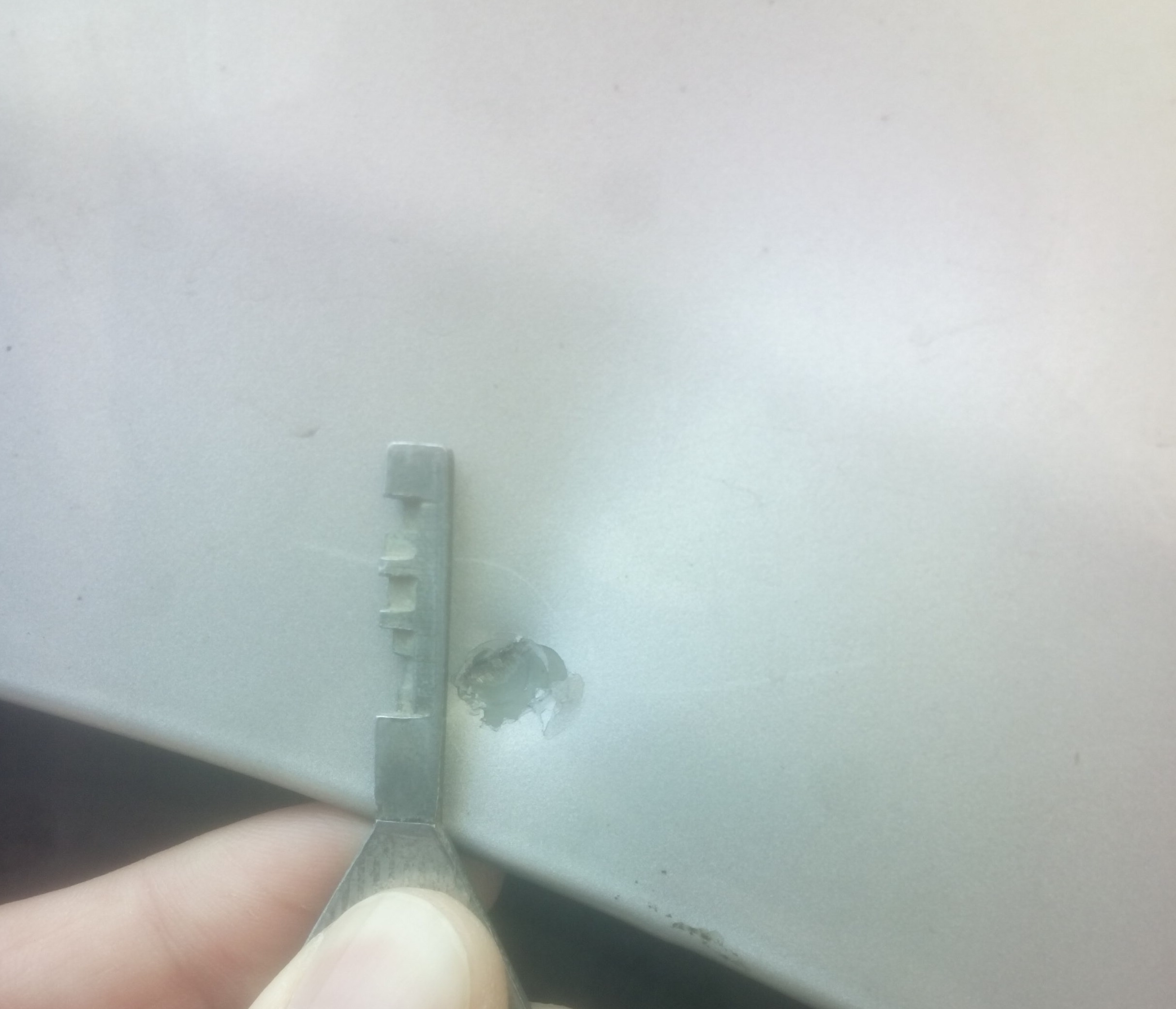 Вот такой сюрприз, вчера вечером обнаружил. Сколько будет стоить вытянуть + закрасить. Там скол до металла. Фотик в телефоне "засорился" потому и качество неважнецкое. Но мне нужен "порядок цен"