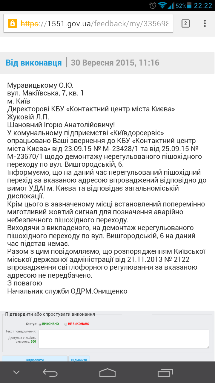 Написал обращение в КГГА с просьбой поставить светофор на кнопке или убрать переход вообще. Вот ответ: