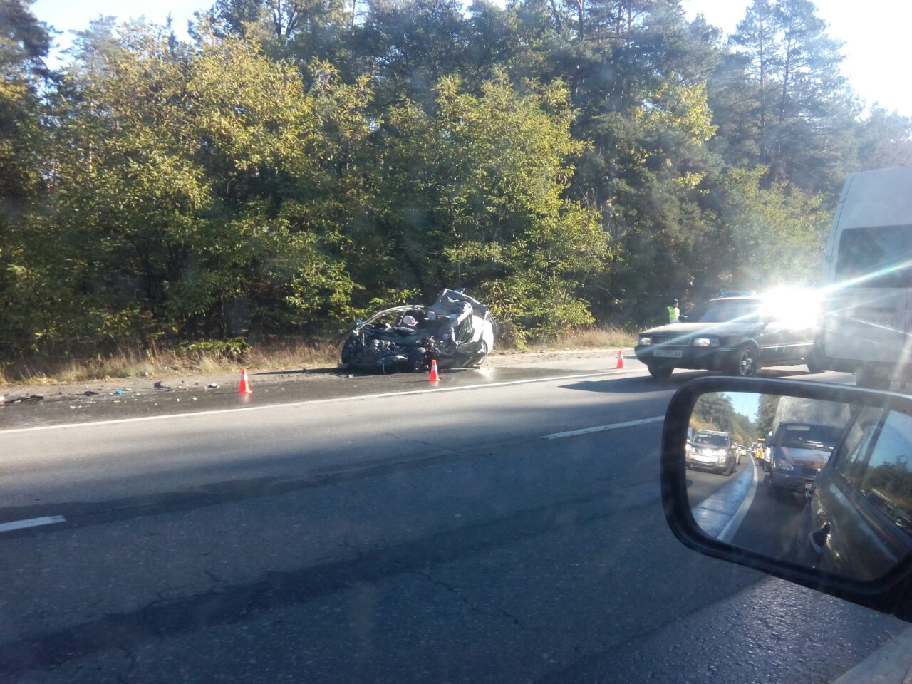 Сьогодні, 9 жовтня, на Гостомельській трасі під Києвом сталася жахлива дорожня аварія. Про це повідомляє кореспондент ТСН.ua. Легкове авто невідомої марки влетіло під вантажівку. Після удару фура з'їхала з дороги, а легковик повністю згорів. За словами водіїв, які перебували на місці події, люди, які перебували у салоні легковика, загинули.