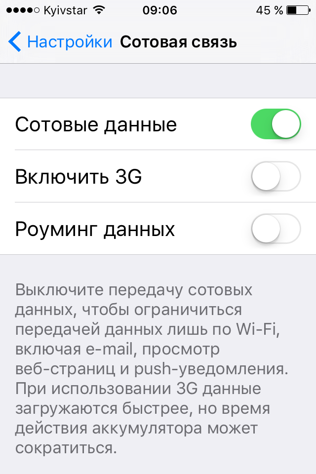Спсб. я наконец то допер что вы все имели ввиду. я просто нуб в еплах. у жены в 5s отключил за 3 секунды 3г а у малой в 4s немогу. нет там нигде такого ползунка. все сотовые данные могу отключить в роуминге тож могу вкл/вкыл. а 3г нету.
