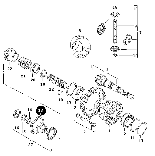 Подписи к позициям: 7 - concave washer (internal teeth) 8 - sealing washer 9 - spring ring ... 19 - constant velosity joint with boot left inner (это, я так понимаю, внутренний ШРУС?)