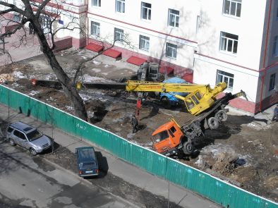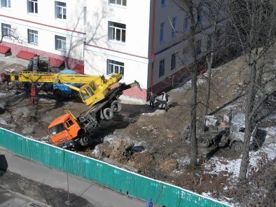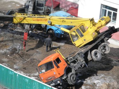 Сегодня средь бела дня рухнул подъемный кран на территории долгостроя на улице Смоленской в г. Киеве (район парка КПИ). На этот раз - Бог миловал - обошлось без жертв. Крановщик отделался легким испугом. Все могло обернуться намного трагичнее, т.к. школа, пешеходная зона и автосоянка совсем рядом от места падения крана. Почесав репу, через некоторое время горе-строители додумались подогнать еще один КАМАЗ и прицепив трос к завалившемуся крану поставили его на колеса.