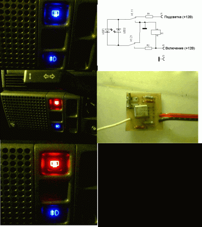Увидел подсветку кнопок у иномарок (в частности у WV-Passat)заболел идеей сделать на своей 21099 что нибудь подобное. У меня получилось так: подсветка ночью - синяя, при включенни - днем и ночью красная. Все это сделал при помощи 3-мм сверхярких светодиодов и реле с двумя группами на переключение.Сама кнопка не переделываалсь. Светодиоды ставятся вместо штатной лампочки, реле на отдельной платке. После переделки стало отлично видно кнопки (ночью) и какая из них включена а какая нет. Цвет может быть разный - взависимости от светодиодов. Кому интересно - спрашивайте!