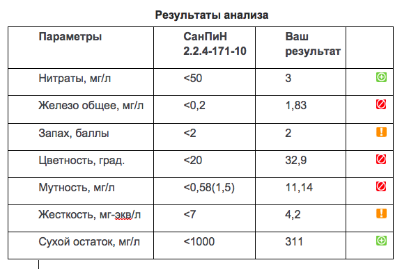 Борись с железом. Берешь результаты и рассылаешь по нескольким конторам, которые занимаются водоподготовкой (подавляющее большинство из них перепродает экомикс от экософта, поэтому разнообразия технических решений не ожидай). Им нужно будет знать также количество точек разбора воды (кранов в квартире), чтобы оценить производительность системы. Потом выбираешь по цене. Еще можешь запостить картинку с результатом анализа в профильной ветке на строимдоме, там вменяемые технологи пасутся - могут сразу и цены назвать. Вода из скважины? Что с водой в соседних домах?