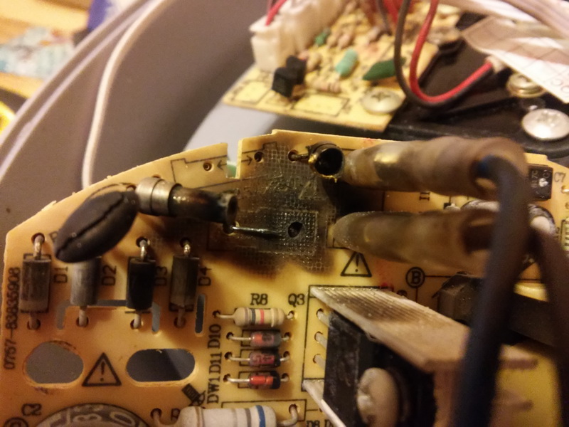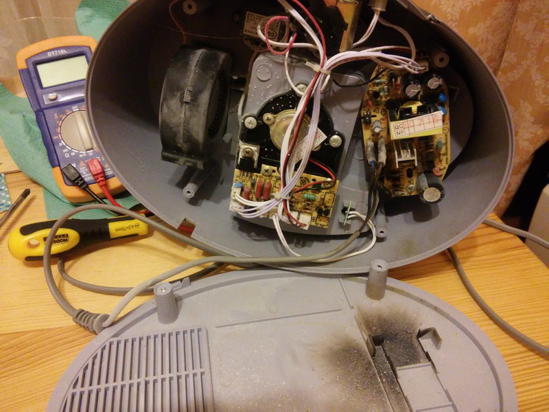Перестал работать увлажнитель воздуха на работе, после праздников. Разобрал, видно был скачок напряжения, предохранитель один или два? сгорели напрочь, и варистор это наверное, тоже аж треснул. Итого, надо подобрать что-то вместо сгоревшего и припаять на место. Самому не предлагать, руки не совсем оттуда )))