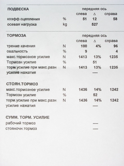 Меня немного напрягла дельта в 13%! между левым и правом колесом по "торм. усилие при макс разн." (как бы это еще полностью расшифровать). По идее, при торможении "в пол" машину должно развернуть при такой дельте.