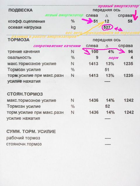 Итак Подвеска Первые показания по работе амортизаторов правого и левого переднего колеса. Вроде ще в норме, средняя цифра - разница между амо - допустимая. Нагрузка на ось - вес, приходящийся на передок.