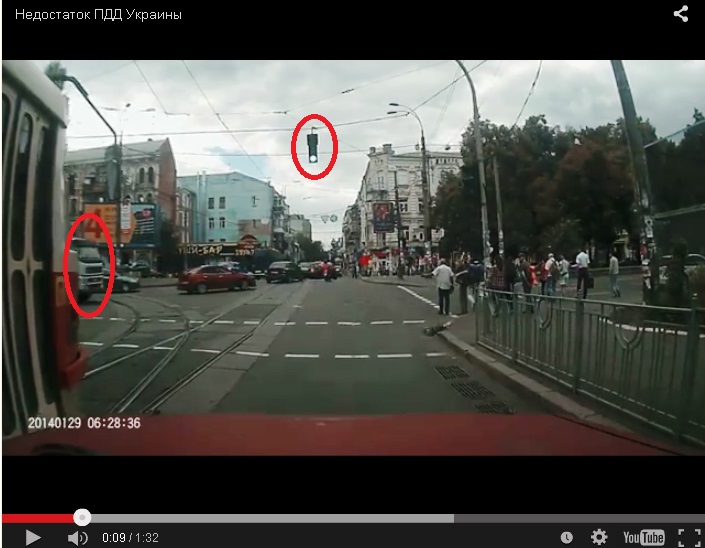 Вполне логичный пункт. Но для того, чтобы его выполнить, нужно, чтобы пока ты выезжаешь с перекрстка, стояли те, кому заорелся зелёный. Поэтому есть "корреспондирующий" пункт: 16.5. У разі подання сигналу регулювальником або ввімкнення сигналу світлофора, що дозволяє рух, водій зобов'язаний дати дорогу транспортним засобам, що завершують рух через перехрестя, а також пішоходам, які закінчують перехід. Только, как обычно у нас, про права пешеходов закончить переход - сказано. А про обязанность пешеходов уступить дорогу тем, кто заканчивает проезд перекрёстка, - "забыли"! Результат видим на этом фото. С включением зелёного вся эта не смотрящая по сторонам бездумная толпа немедленно двинулась вперёд, - это жестадный инстинкт: все пошли и я пошёл, думать и смотреть не нужно, - по сторонам смотреть же тоже никто не обязал! Пусть весь мир подождёт. А эти, которые "наворовали на машины", с точки зрения пешеходов, - особенно! В результате водителя грузовика лишили физической возможности, не передавив никого, выполнить требования п.16.5. Он оказался заперт на перекрёстке, а вместе с ним и те, кому загорелся зелёный. Причём в данном случае - и "классово близкие", которые в трамвае (он там слева, и его звонок тоже слышен)... О чём пешеходы, конечно, тоже не подумали (от них никто не требует, чтобы они были способны мыслить). А уже после перекрёстка обращает на себя внимание поведение двух водителей, которые влазят в ряд, нагло тормозя едущих сзади. И только для того, чтобы перепарковаться через несколько машин. Тут уже не только наглость, но и отсутствие элементарной логики...
