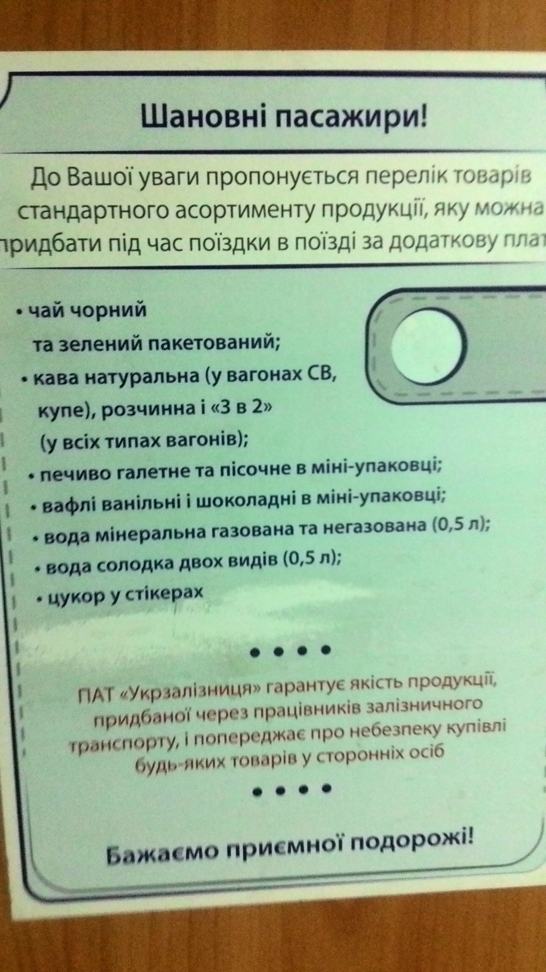 Так там же: Укрзалізниця гарантує, напісано. Нє віжу повода нє доверять, у ніх всьо чьотєнько Вон и кнопку вызова проводника нарисовали, жми!
