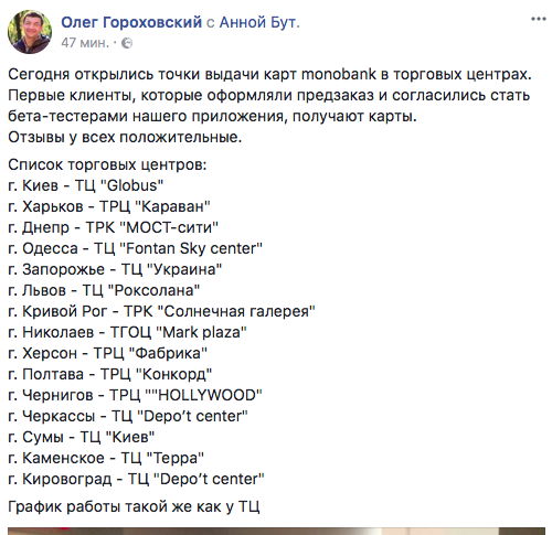 Сегодня открылись точки выдачи карт monobank в торговых центрах. Первые клиенты, которые оформляли предзаказ и согласились стать бета-тестерами нашего приложения, получают карты. Отзывы у всех положительные. Список торговых центров: г. Киев - ТЦ "Globus" г. Харьков - ТРЦ "Караван" г. Днепр - ТРК "МОСТ-сити" г. Одесса - ТЦ "Fontan Sky center" г. Запорожье - ТЦ "Украина" г. Львов - ТЦ "Роксолана" г. Кривой Рог - ТРК "Солнечная галерея" г. Николаев - ТГОЦ "Mark plaza" г. Херсон - ТРЦ "Фабрика" г. Полтава - ТРЦ "Конкорд" г. Чернигов - ТРЦ ""HOLLYWOOD" г. Черкассы - ТЦ "Depo’t center" г. Сумы - ТЦ "Киев" г. Каменское - ТЦ "Терра" г. Кировоград - ТЦ "Depo’t center" График работы такой же как у ТЦ