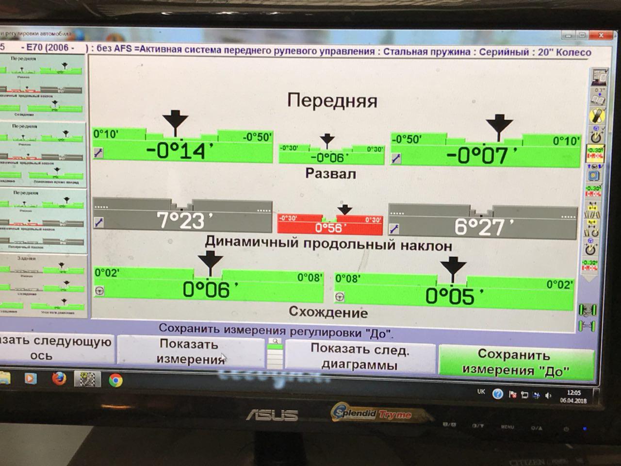 Здравствуйте ребят, взял F15 в январе этого года. Приехала машина 90к пробега со штатов, сейчас 96500. Проездил на 18-й зиме 5к - полет отличный, переобулся на лето 20 оригинал 468стиль, первые 500 км было все ок, затем последнюю тысячу машину сильно стало вести вправо. Пока записывался на диагностику к ОД в Киеве - решил заехать на диагностику развала. Мастер спросил не ведет ли меня вправо? Я сказал, что ведет. Ответ мастера - углы выставлены хорошо, видно, что человек, который делал развал старался, а вот динамичный продольный наклон в два раза хуже нормы и проблема в правом переднем рычаге. Предложил мне сделать фото и показать это дилеру, что я и сделал. Вот фото угла наклона: