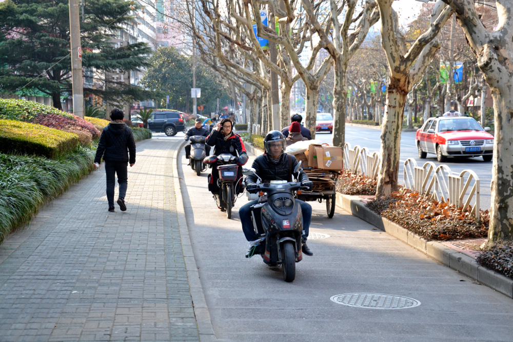 Опять же, стоит не стесняться и развивать мото- и велосипедную инфраструктуры, рсширять дороги и встраивать отдельные полосы для любителей передвигаться не на машине...А если кризис затянется, то многим киевлянам только этот вид транспорта будет по карману Вот такоая отдельная полоса - сплошь и рядом в Шанхае, со своей разметкой и светофорами...Красное такси на заднем плане - Фольксваген Сантана,основная марка в Шанхае, как у нас Логаны сейчас