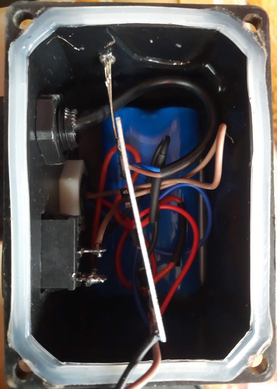 Внутри каждого два "припаянных" ( в одном пластиковом синем "корпусе") аккумулятора 18650, 3,7В. Посмотрел , что внутри, через года 3 эксплуатации. Ожидал , что аккумуляторы съёмные, как в пульте ДУ телевизора.