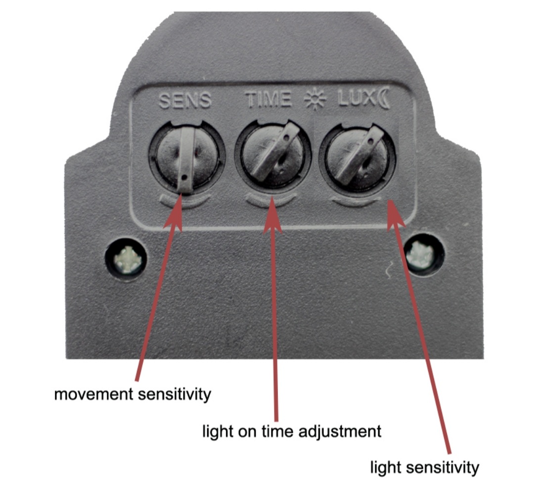 Три регулировки ( чувствительность датчика движения (настраивается например для исключения срабатывания на маленький оъект ( птица, кот, собака...). Срабатывает ( продектор включается) если есть движение с расстояния ~5-7 метров. Уровень освещённости при котором он автоматически включается (яркое солнце, закат солнца, но ещё светло и до полной темноты). Время , которое он должен светить после включения ( срабатывания по датчику движения).