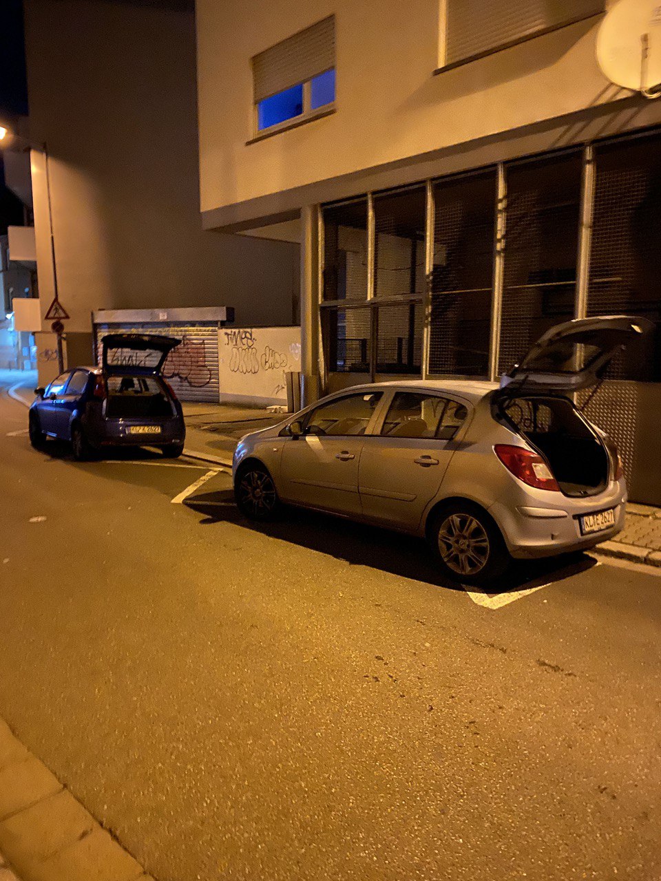 Они стоят на разметке парковка запрещена, возможно грузят чтото и оставили багажник открытым. Или на минуту заскочили кудато, и открыли багажник типа притворяются что грузят чтото. Так точно никто не паркуется на всю ночь.