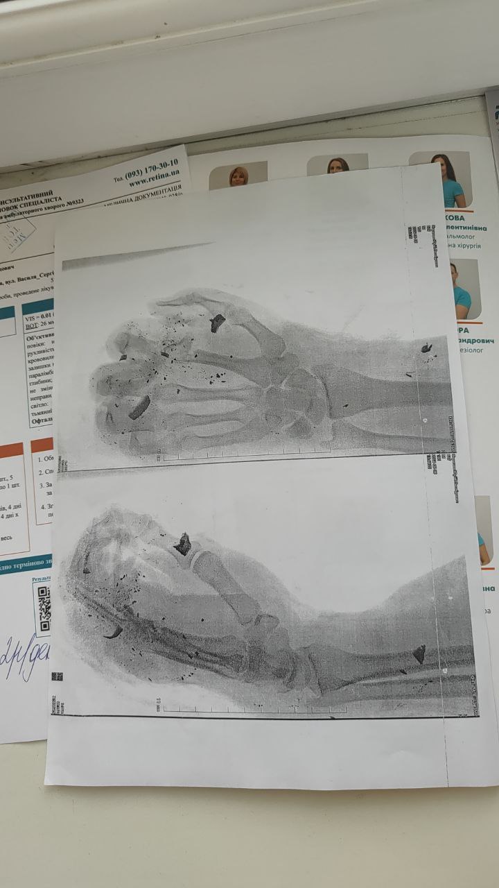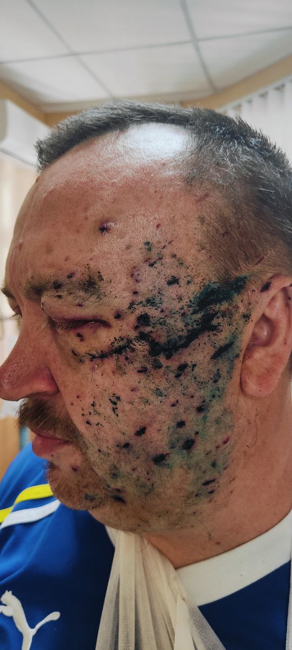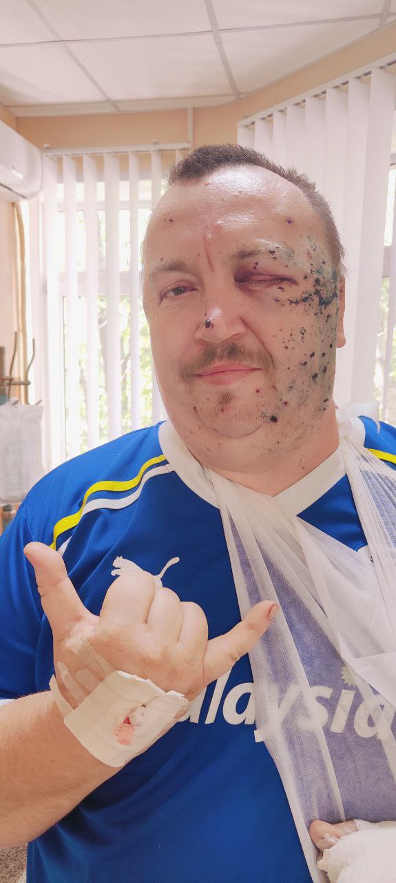 Розбита кисть лівої руки. Був майже ампутований вказівний палець. Відсутній суглоб вказівного пальця. В оці множенні проникні скалки. Операцію на оці зробили, великі залізяки прибрали. Малі ще лишилися. 2 місяці будуть загоюватись рани, потім повторні операції по руці і установка кришталика. Кришталик буду вставляти за свої гроші.